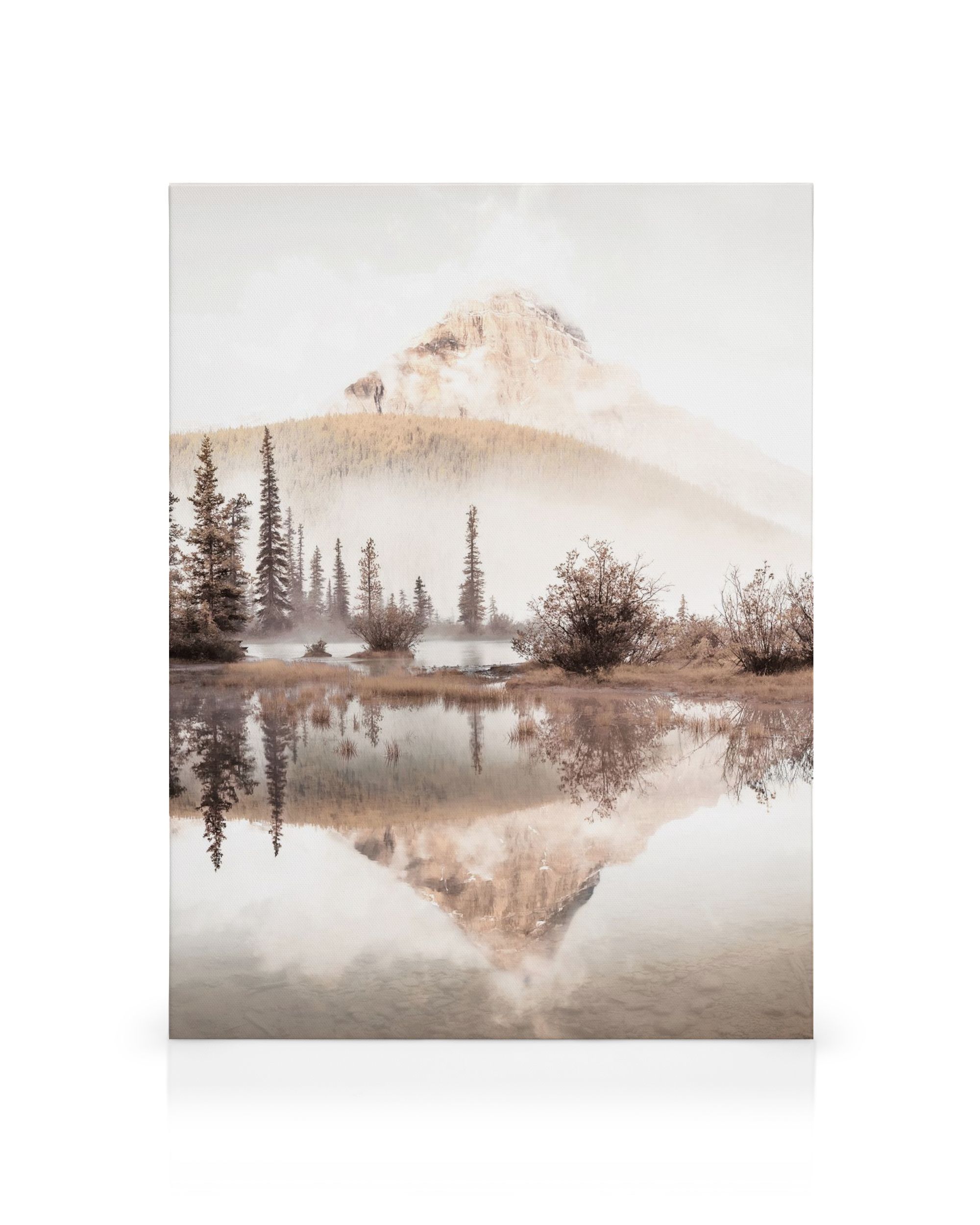 Od 31,80 złSpokojny obraz majestatycznej góry odbijającej się w spokojnym jeziorze, utrzymany w palecie stonowanych brązów, bieli i szarości.