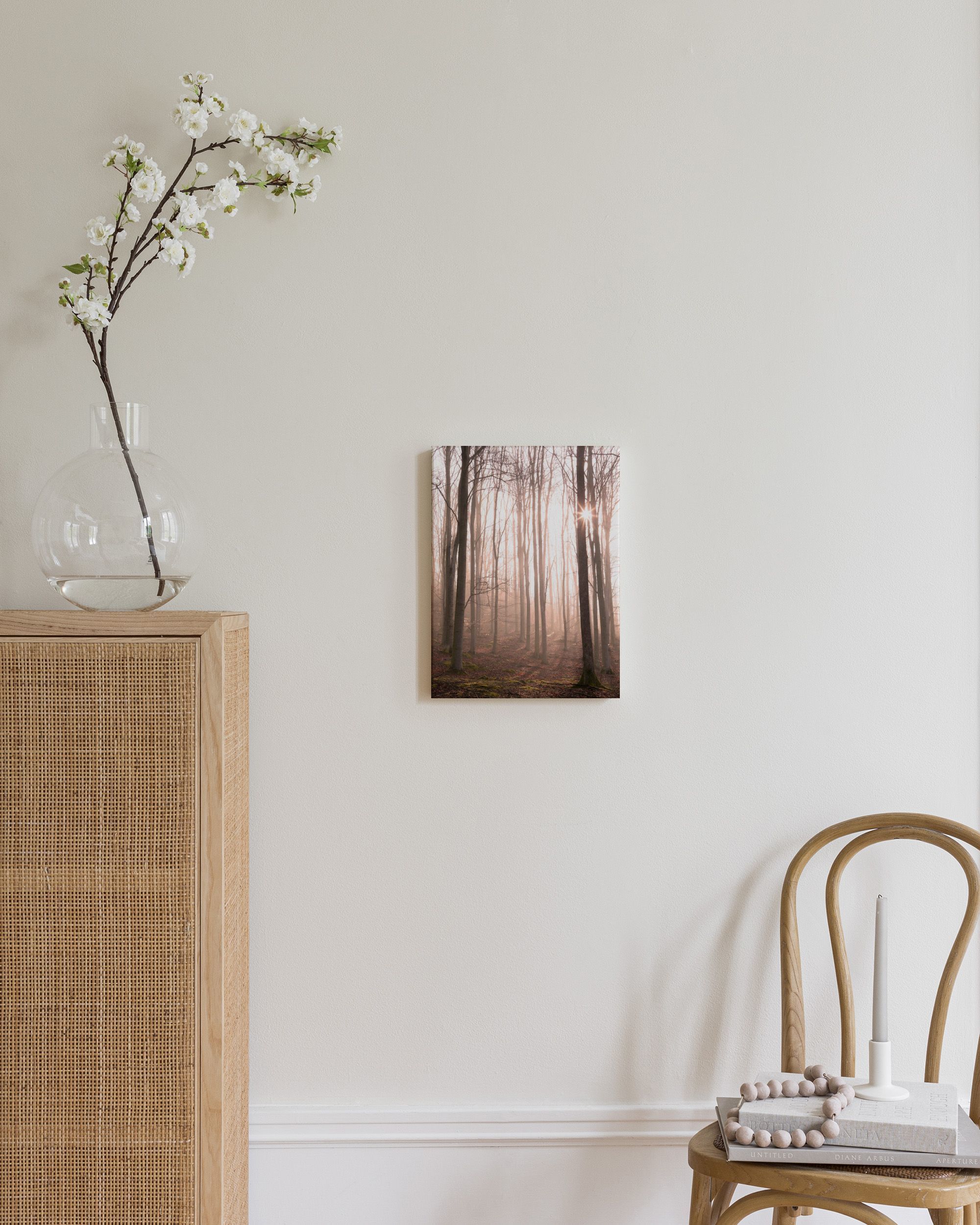 Plakat przedstawiający wysokie drzewa we mgle w lesie. Światło prześwieca przez mgłę, tworząc spokojną atmosferę w różowych odcieniach.