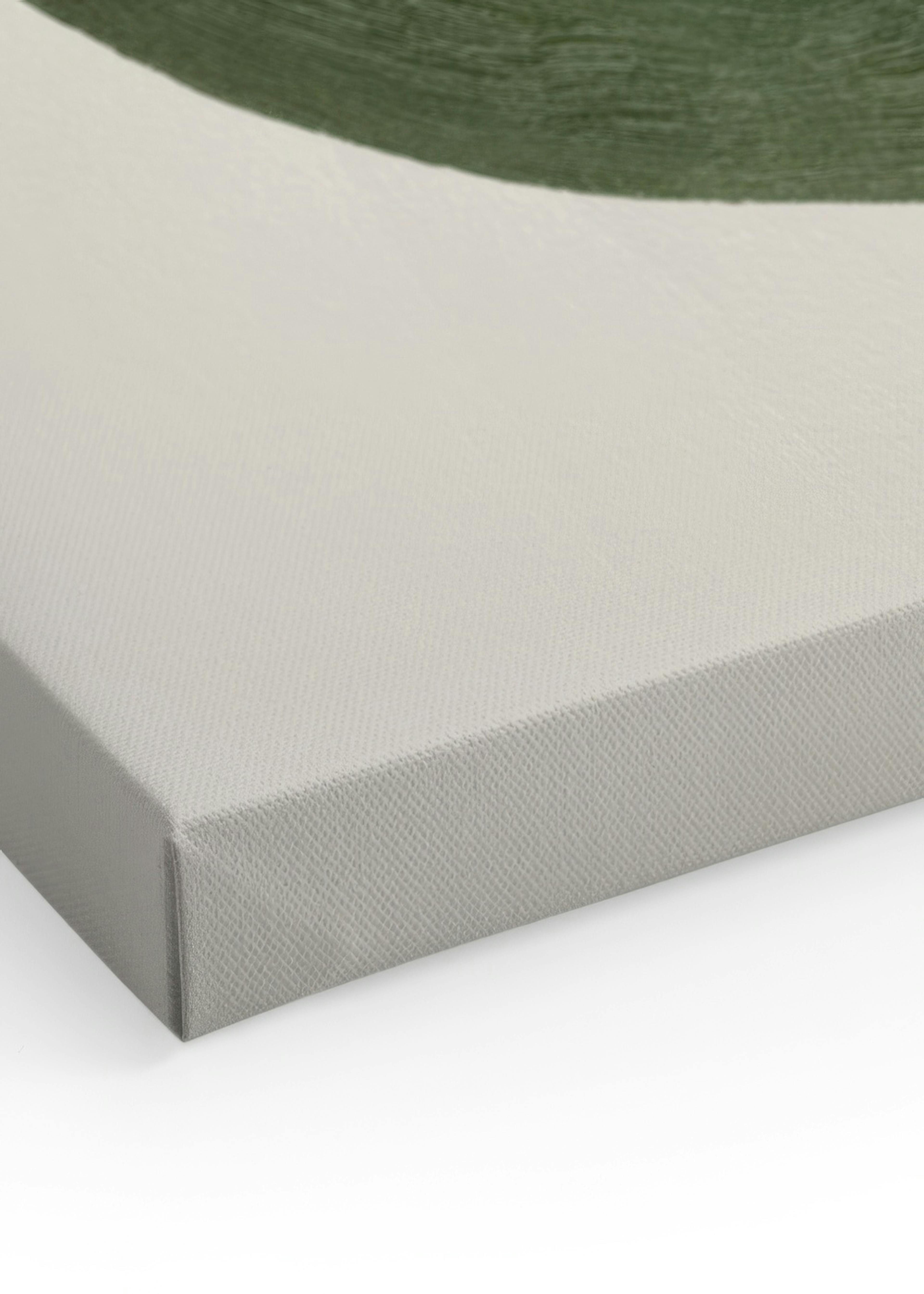 Od 15 złAbstrakcyjny obraz z trzema zakrzywionymi zielonymi kształtami przypominającymi półksiężyce, ułożonymi jeden na drugim z bladym kołem na górze, na tle w kolorze off-white. Kształty mają teksturowane zielone pociągnięcia pędzla, tworząc unikalny obraz.