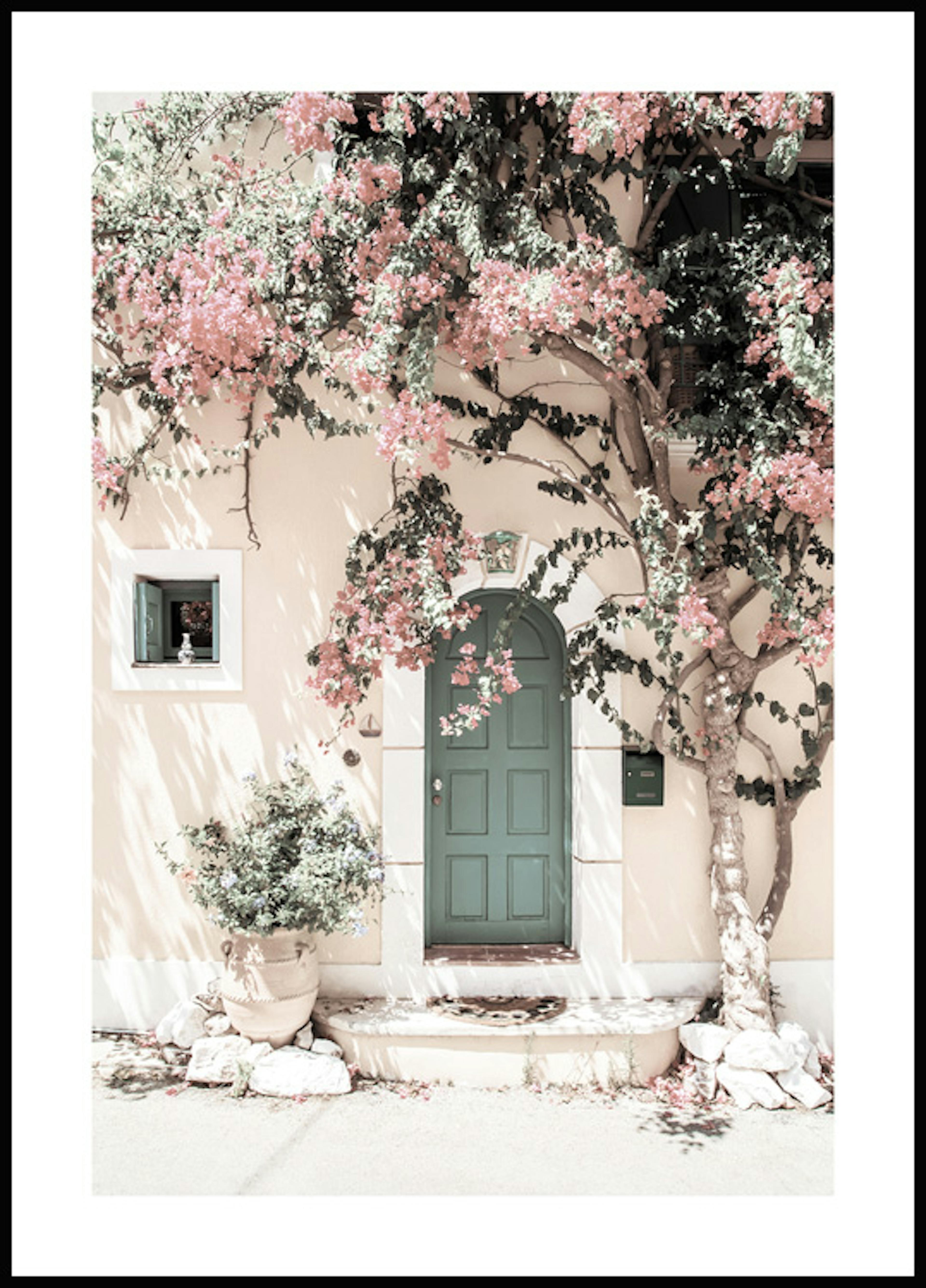 Elegancki plakat z ilustracją różowego kwiatu namalowanego akwarelą. Różowe i zielone barwy kwiatu stoją w pięknym kontraście z białym tłem plakatu.