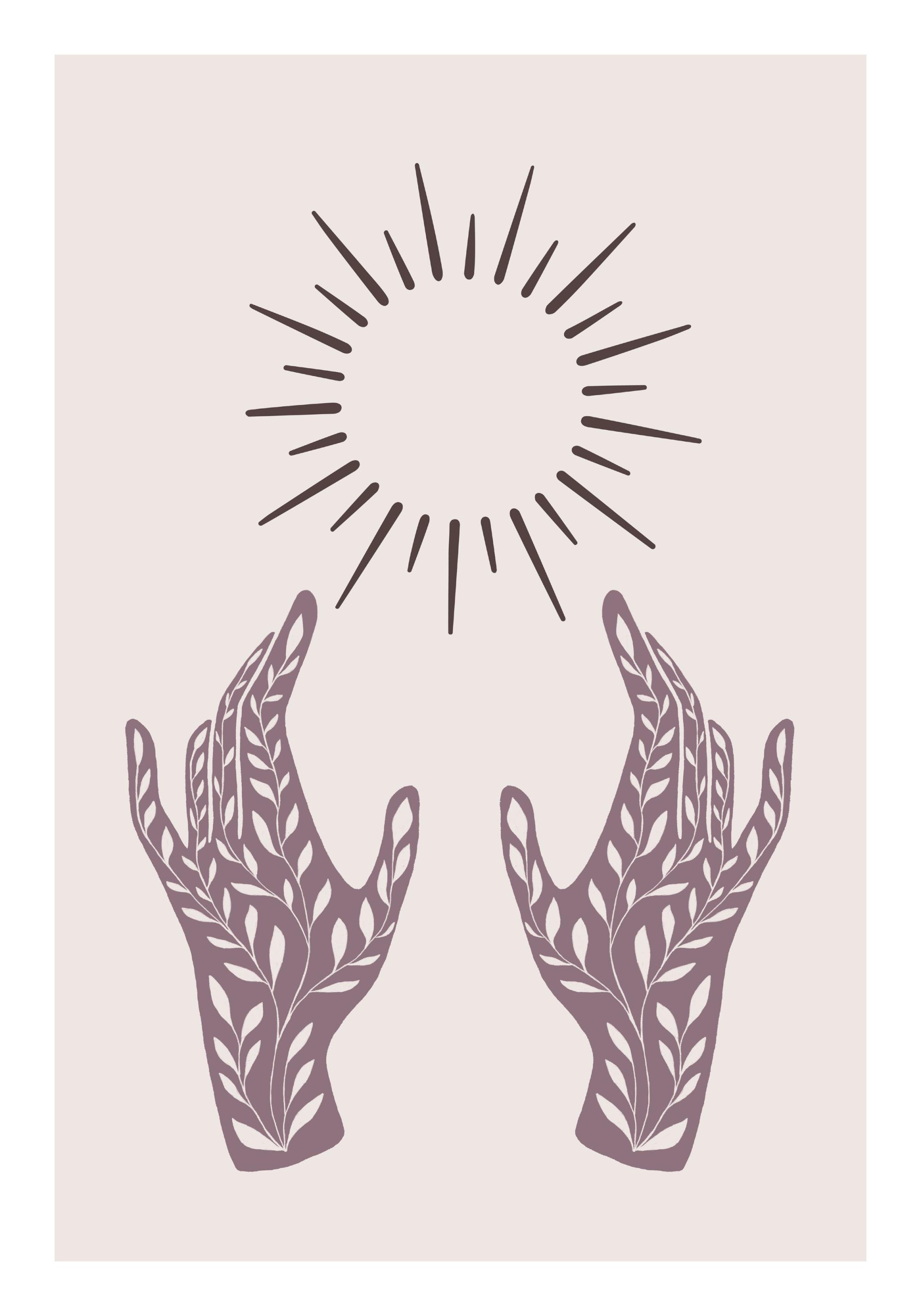 Od 37,10 złPlakat z ilustracją przedstawiającą dwie dłonie i słońce w kolorze pudrowego fioletu na beżowym tle. Stwórz spokojny i duchowy nastrój w domu przy pomocy uspokajającego plakatu.