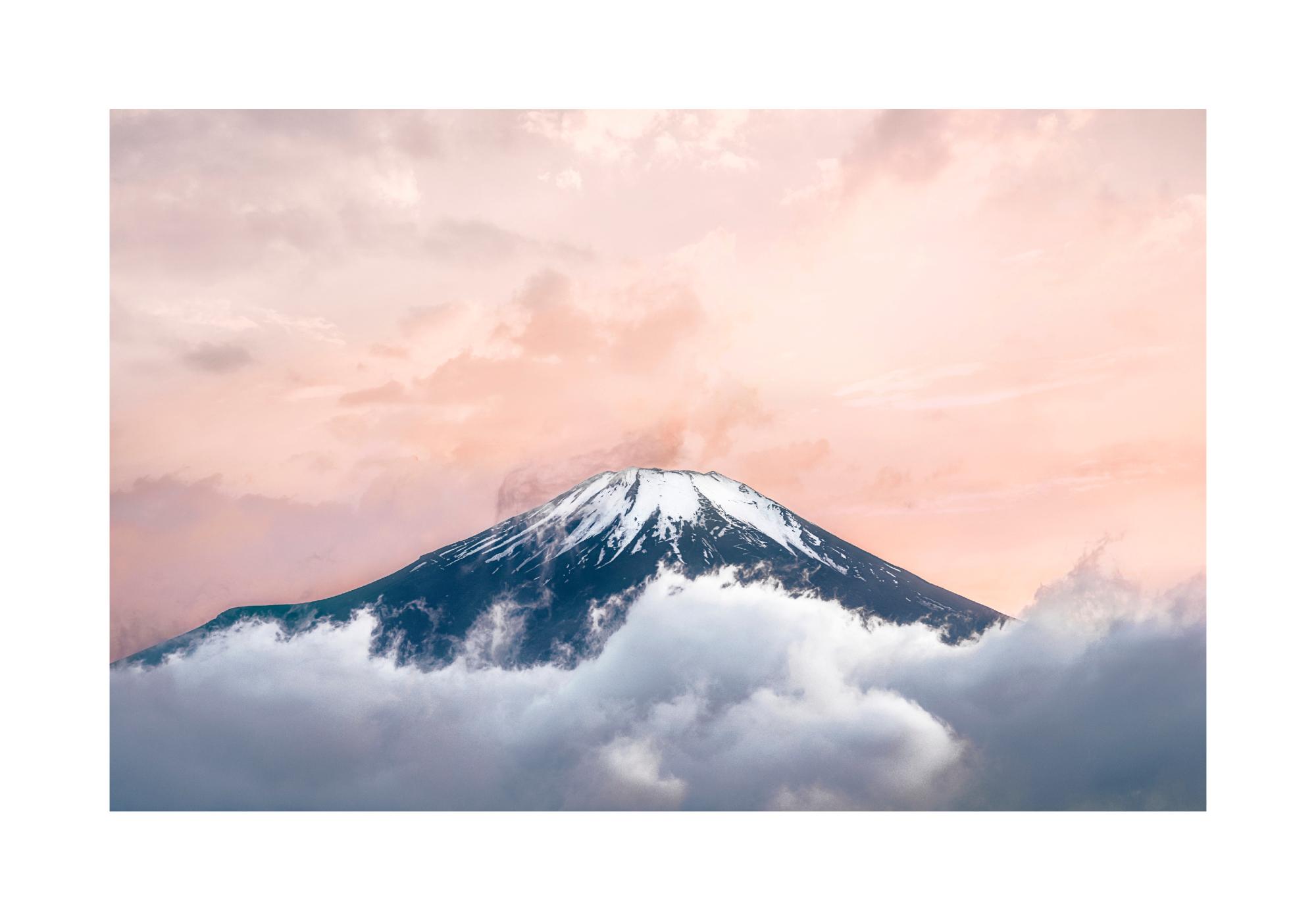 Od 37,10 złZdjęcie zamglonej góry Fuji w formacie krajobrazowym. Wśród pięknych kolorów różu i bieli można dostrzec ciemną górę ponad białymi chmurami. Połącz ten plakat z plakatem Zachód Nad Mount Blanc, jeśli chcesz uzyskać spokojny nastrój w swoim domu