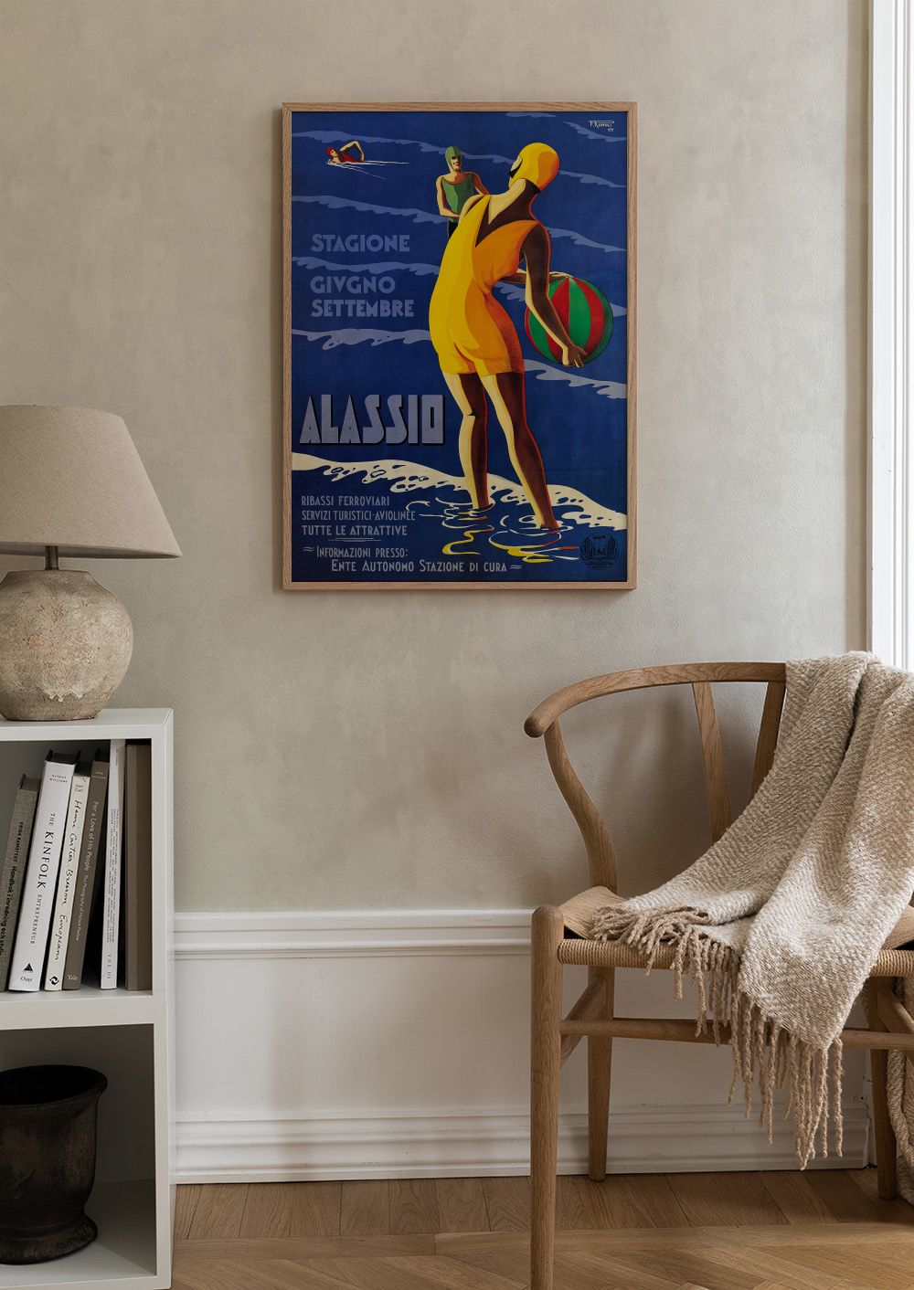 Od 32,40 złPlakat w stylu vintage przedstawiający osobę w żółtym stroju kąpielowym trzymającą piłkę plażową. W tle widać morze z białymi falami w kolorowych, śmiałych kształtach.
